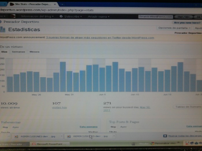 En el día de ayer, 20 de junio de 2011, el Blog Pescador Deportivo llego a las 10000 visitas luego de tres meses de haber sido creado (el 28 de marzo de 2011 para ser mas preciso). !MUCHAS GRACIAS POR TU APORTE!