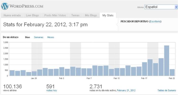 En el día de la fecha, 22 de febrero de 2012, el blog Pescador Deportivo llego a las 100.000 visitas. !Muchas gracias a todos los que nos visitaron y visitan!