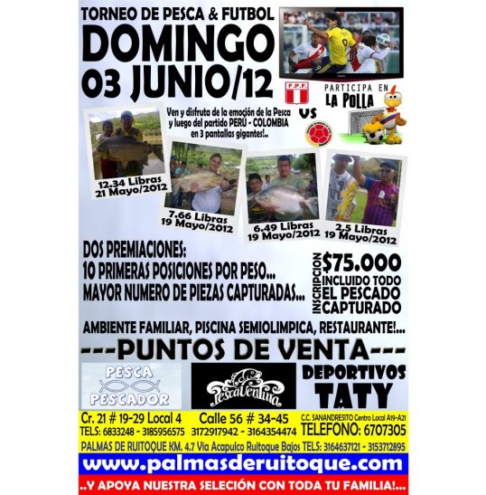 Se llevara a cabo el 3 de junio de 2012 en Palmas de Ruitoque, Colombia, antes de que trasmitan en 3 pantallas gigantes el partido entre Perú y Colombia, por fecha de eliminatorias rumbo al mundial Brasil 2014. Se premiara a las 10 primeras posiciones por peso y al mayor número de piezas capturadas. A continuación, mas detalles.