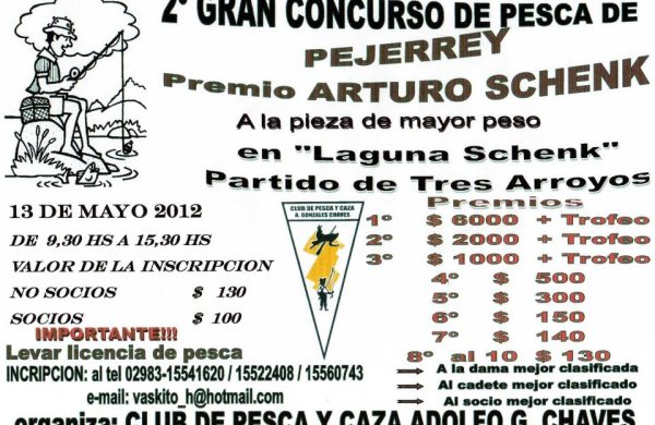 El 13 de mayo de este año se celebrara en la laguna Schenk, parrtido de Tres Arroyos, el 2° Concurso al pejerrey de mayor peso desde las 09:30 hasta las 15:30 horas.… Leer más 2° Gran Concurso al pejerrey de mayor peso en Laguna Schenk, Tres Arroyos →